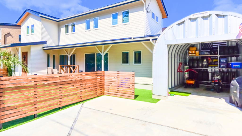 PCフェンスの無骨さ、ヤシの木の躍動感、そして広々としたガレージ。これらの要素をバランスよく配置することで、毎日が映画のワンシーンのような特別な空間に変わります。