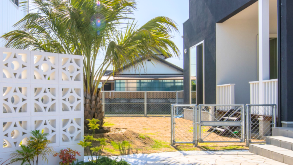 今回の事例に共通するのは、ヤシの木を空間の「核」として配置している点です。高い位置で広がる葉が、視線を上へと誘導し、敷地全体にゆとりある開放感をもたらします。白いフェンスや壁を背景にすることで、シルエットがより鮮明に際立ちます。