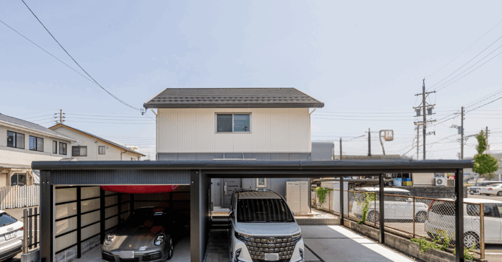 ガレージと一体感のあるデザインのオープンカーポートを設置しました。
