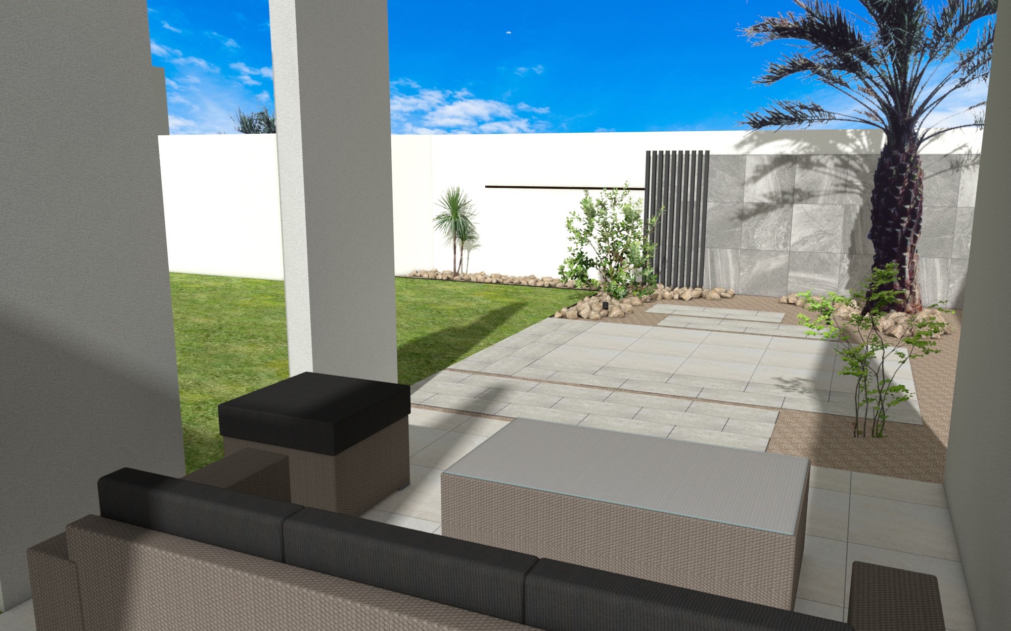 • リゾート感あふれるヤシの木と、モダンな石積みの壁が、非日常的な空間を演出します。