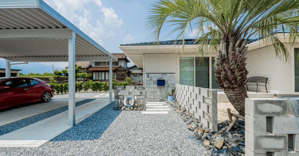 お庭の雰囲気に合わせて、駐車場もリゾート感を意識しました。白いカーポートを設置することで、明るく開放的な印象に。また、建物の外壁の色と合わせた門柱やブロック塀を施工し、統一感のあるデザインに仕上げています。