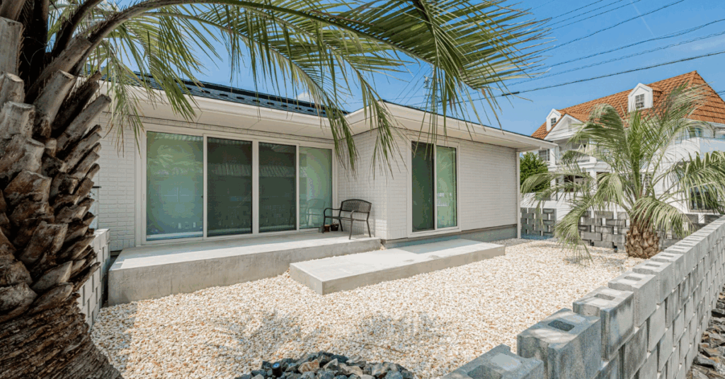 まるでビーチサイド!砂利とヤシの木が彩る庭