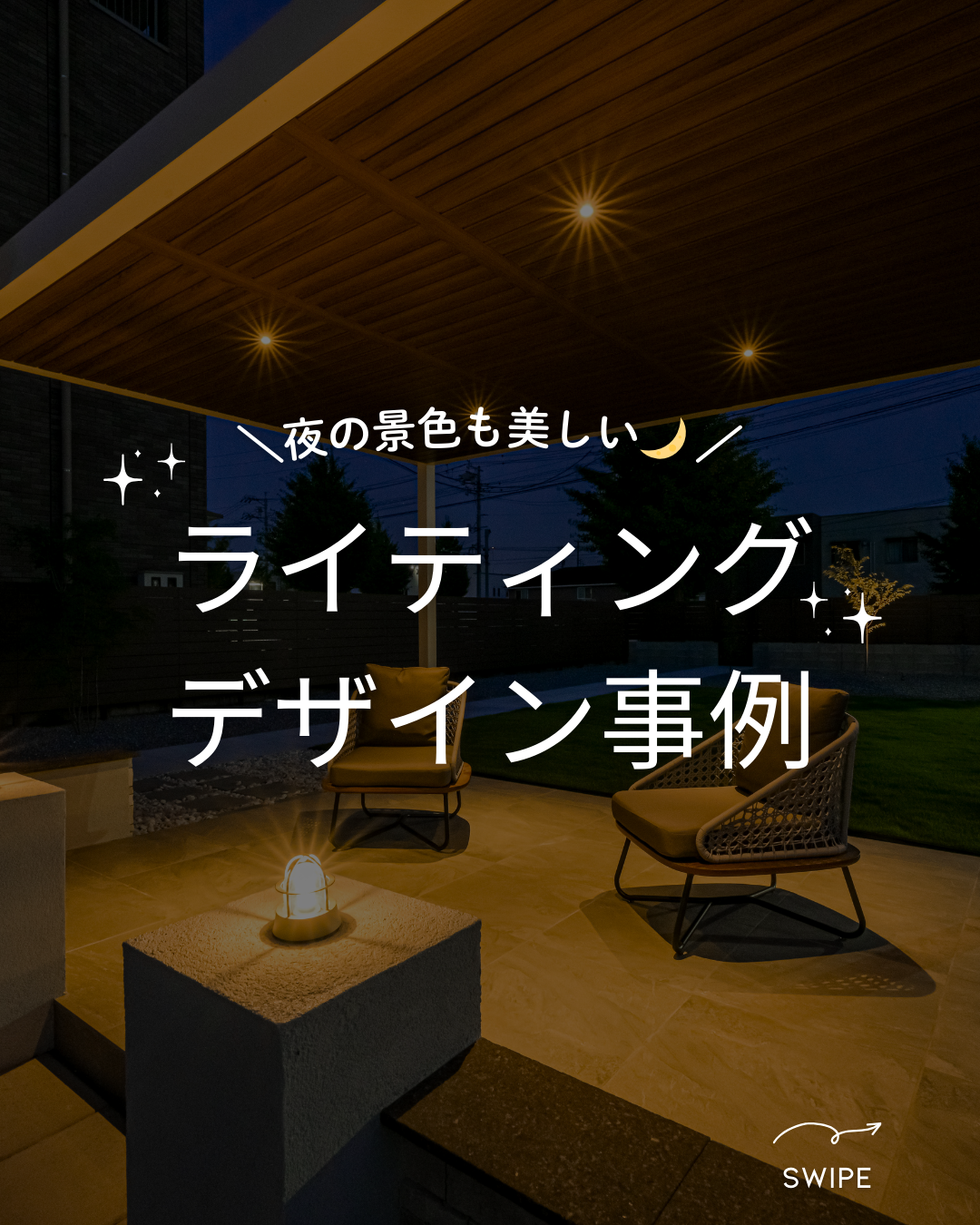 • 特にパーゴラ下のライティングは、リビングの延長のような「アウトドアリビング」の雰囲気を演出し、夜のくつろぎの場として機能させています。