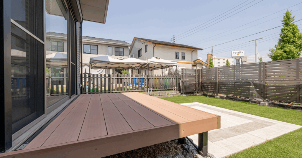 日当たりの良い南向きのお庭にはウッドデッキとタイルデッキを設置。