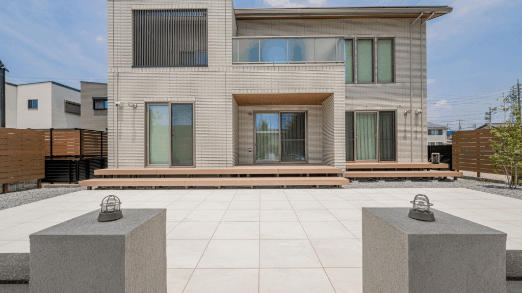2. サッと掃くだけでOK: 広範囲にタイルや石貼りのテラス・通路を設け、土の露出を減らすことで雑草対策と掃除のしやすさを両立。