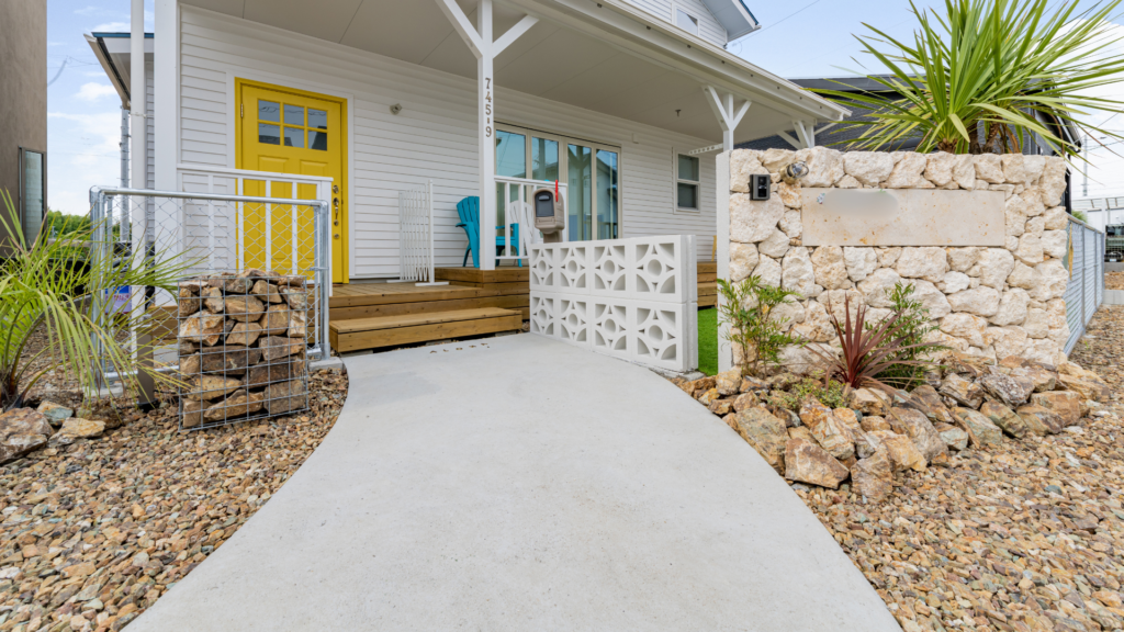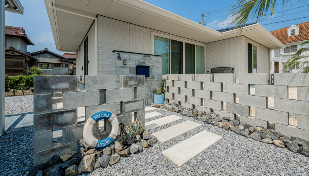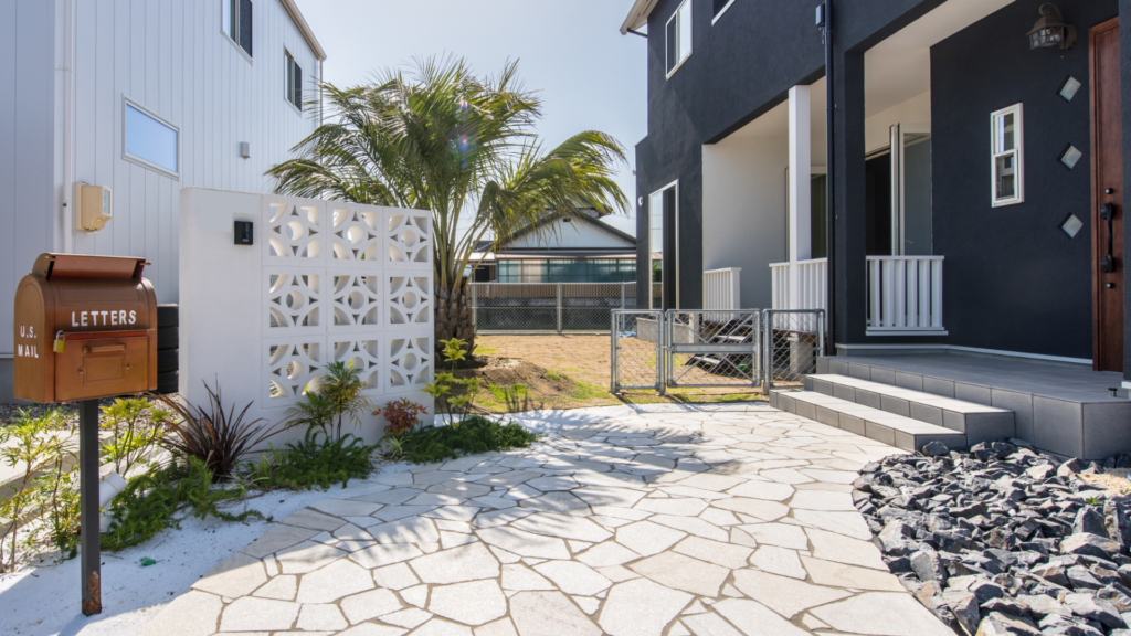 アプローチ周辺には、ヤシ(ソテツなど)や多肉植物といった手入れが比較的容易な植栽を、ゴロタ石や砕石で囲み配置します。これにより、ローメンテナンスでありながら、自然の息吹を感じる空間、つまり「お家から始まるリゾート」のような心地よいアプローチが完成します。