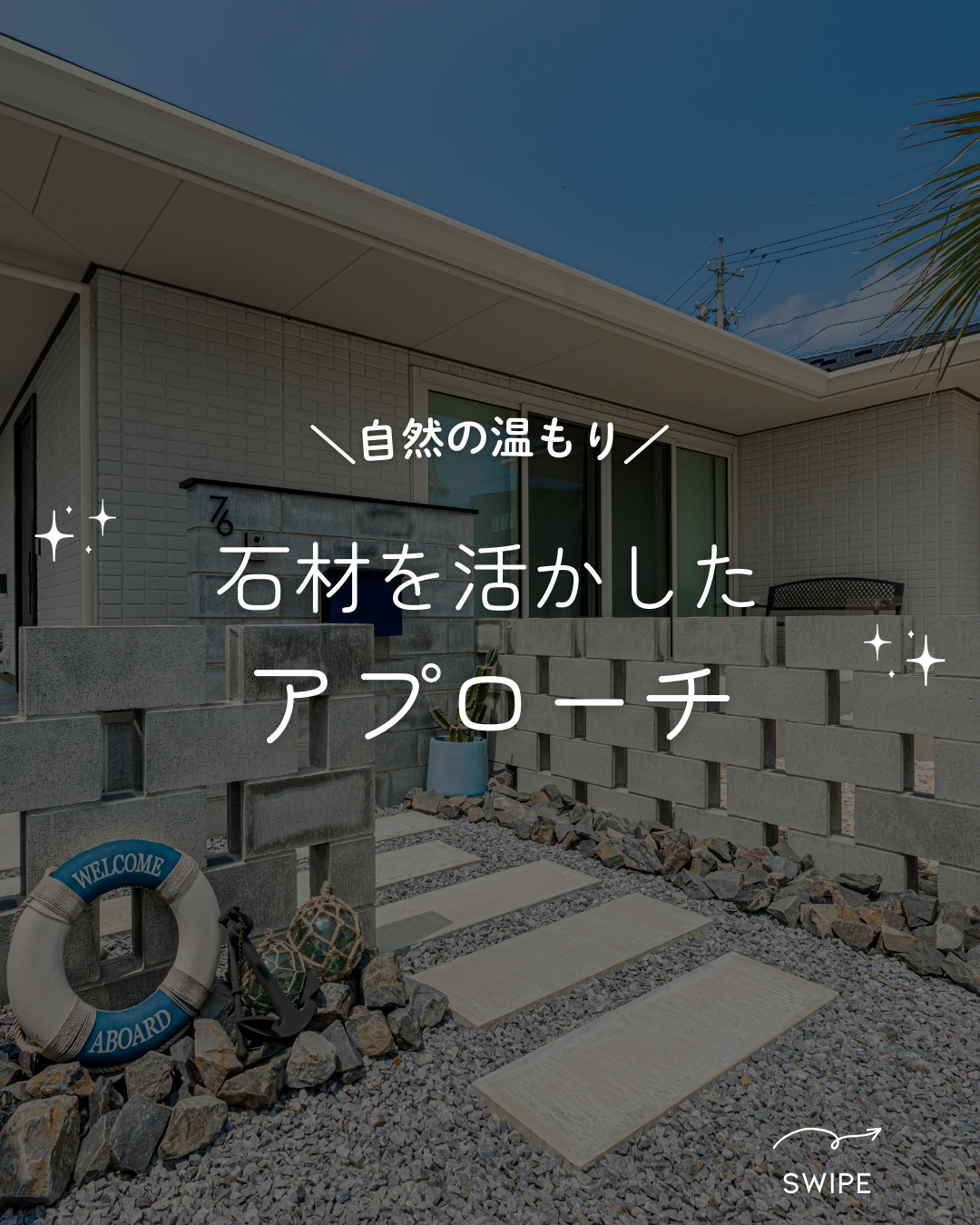 石材を主役としたアプローチは、リゾートや西海岸テイストとの相性が抜群です。