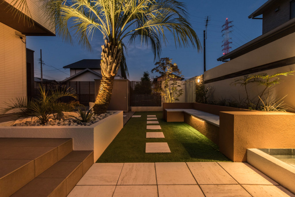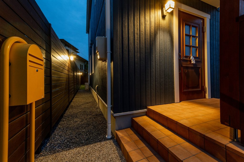 足元灯や植栽の影が、夕暮れ時のアプローチを幻想的に変えます。