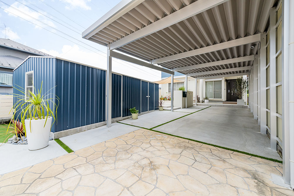 開放感のある、広い屋根付き駐車場。マルチに使えるユーティリティ スペース。